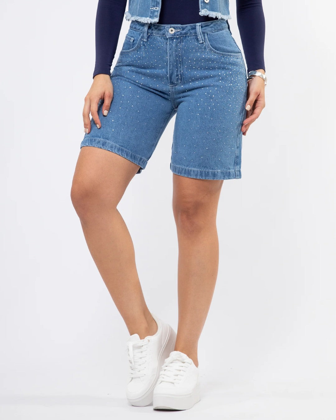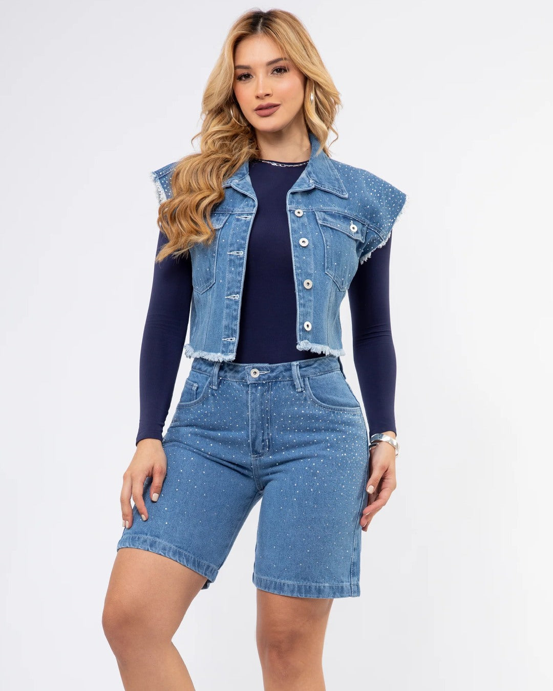Torero con decoración sutil frontal en pedrería, denim rígido 100 % algodón.