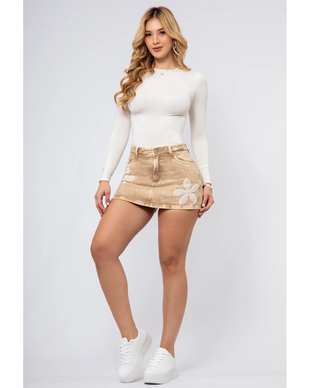 Falda short en denim con detalle de flor tejida en un costado, femenina y moderna para un look casual con estilo.