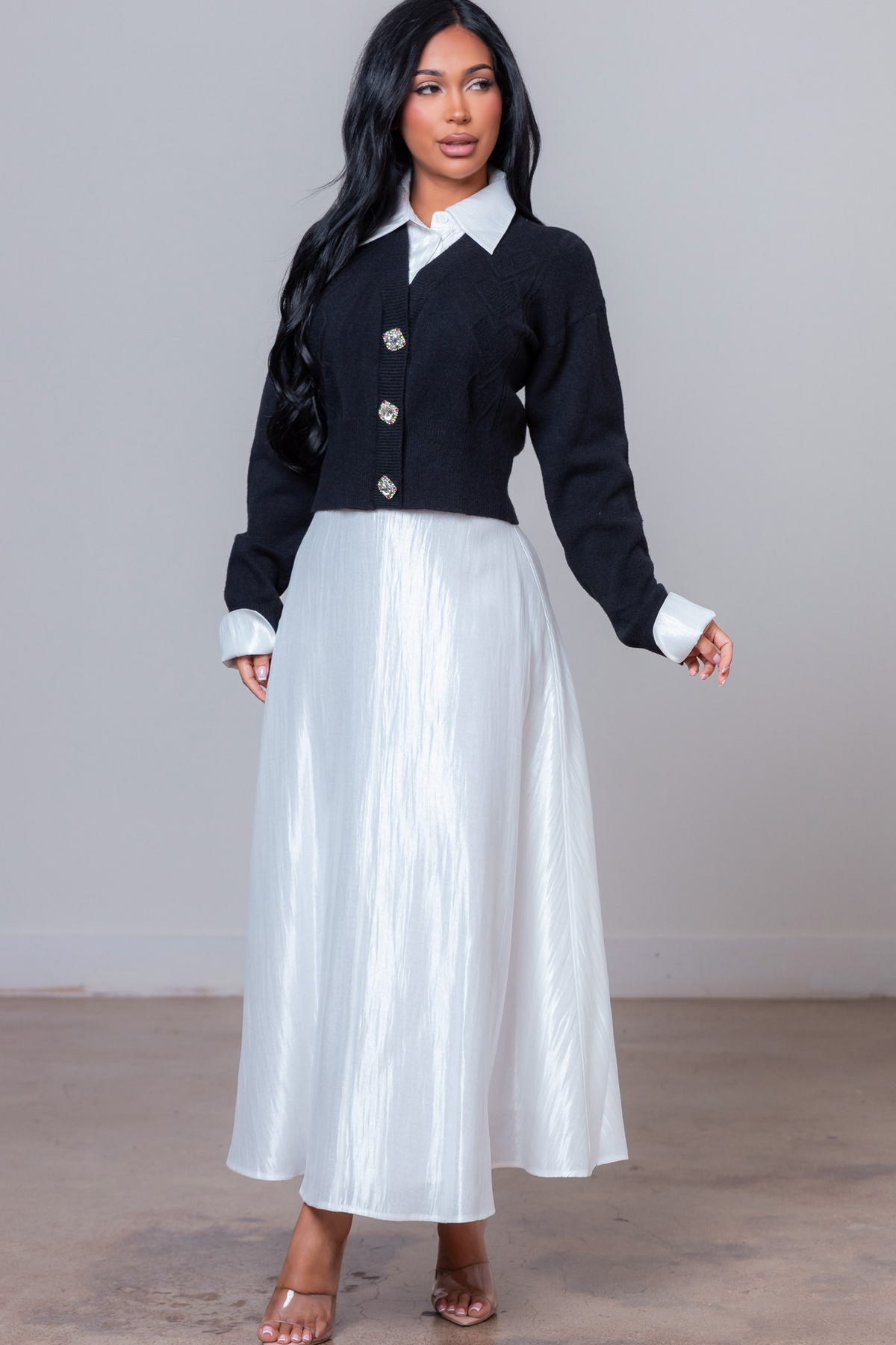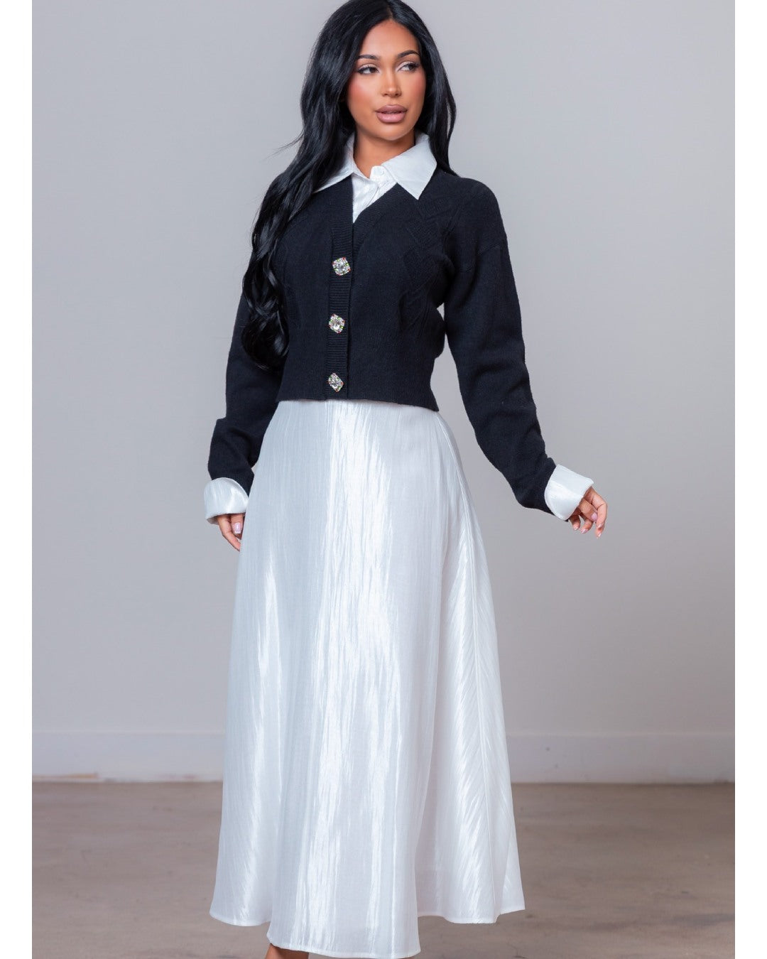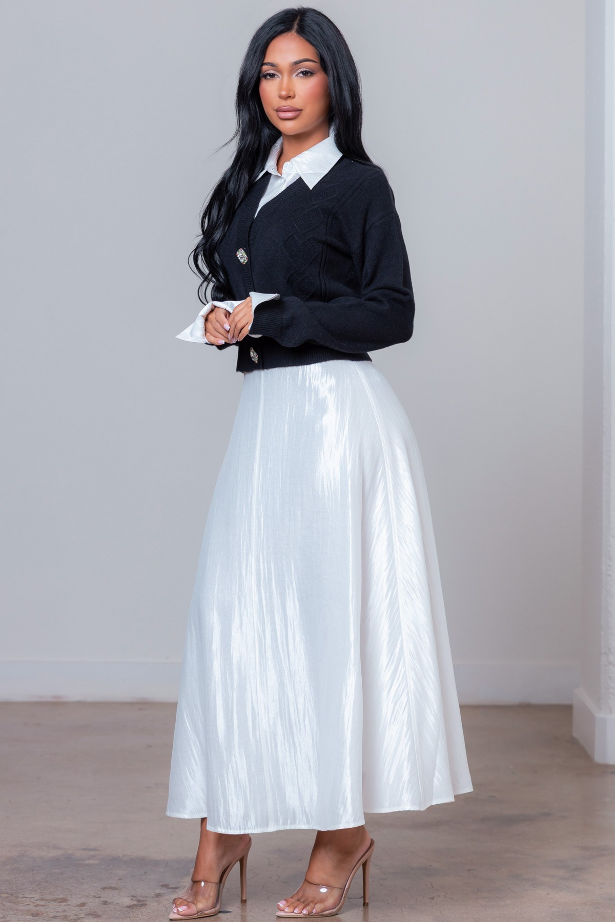 Cozy yet refined two-piece knitted set featuring a sweater top and matching skirt. Soft texture and a flattering fit make it perfect for effortless, polished everyday looks.