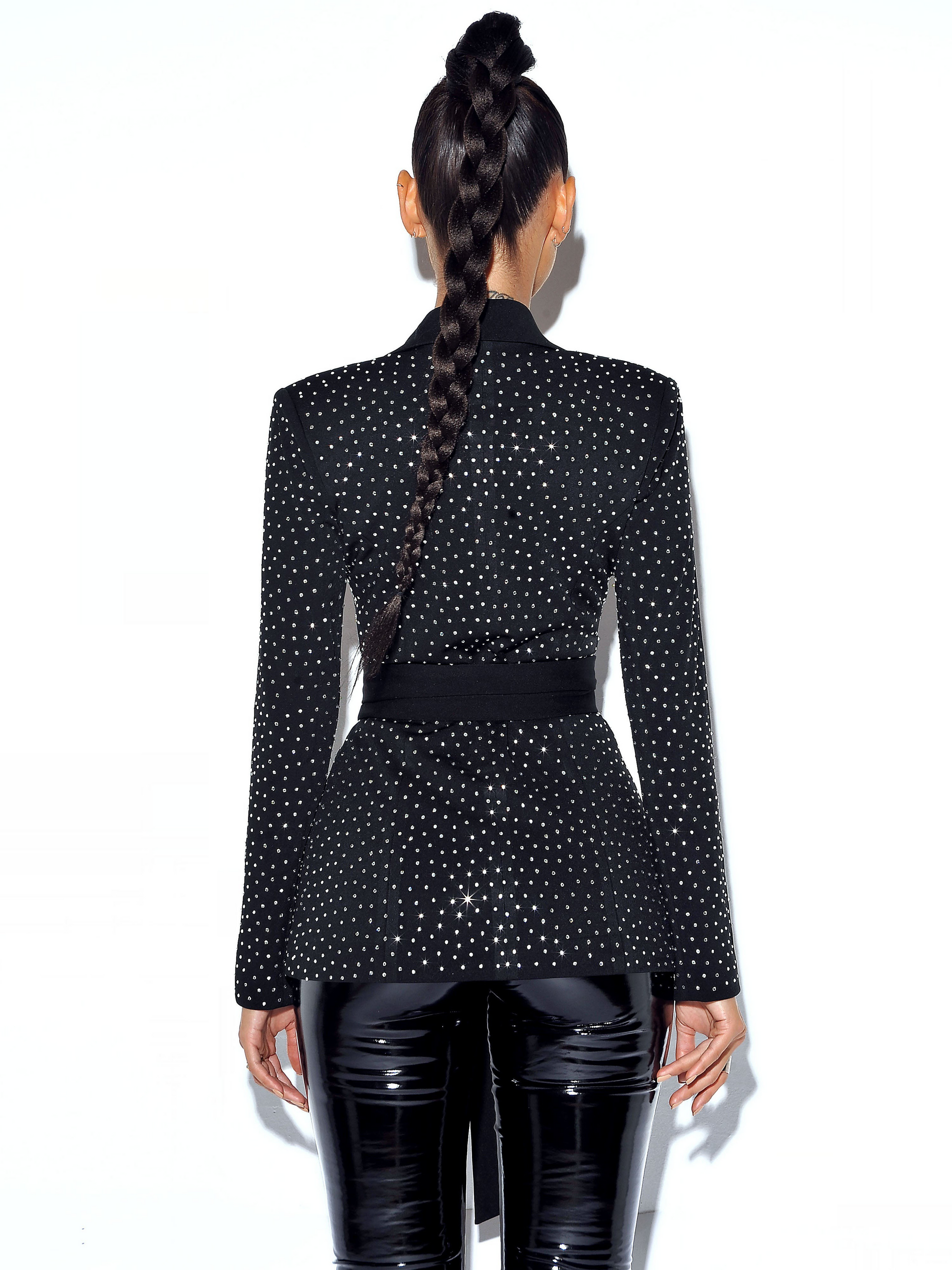 Elevate your style with our Black Rhinestone Blazer – a perfect fusion of sophistication and statement-making glamour. Crafted from premium fabric, this tailored blazer offers a sleek, structured silhouette that flatters every figure. The subtle sparkle of delicately placed rhinestones adds a touch of elegance, making it the ultimate piece for both chic daytime looks and dazzling evening ensembles. Designed with a modern fit, sharp lapels, this blazer is your go-to for effortless sophistication with a hint of shine. Pair it with tailored pants for a power look or drape it over a dress for a refined touch
