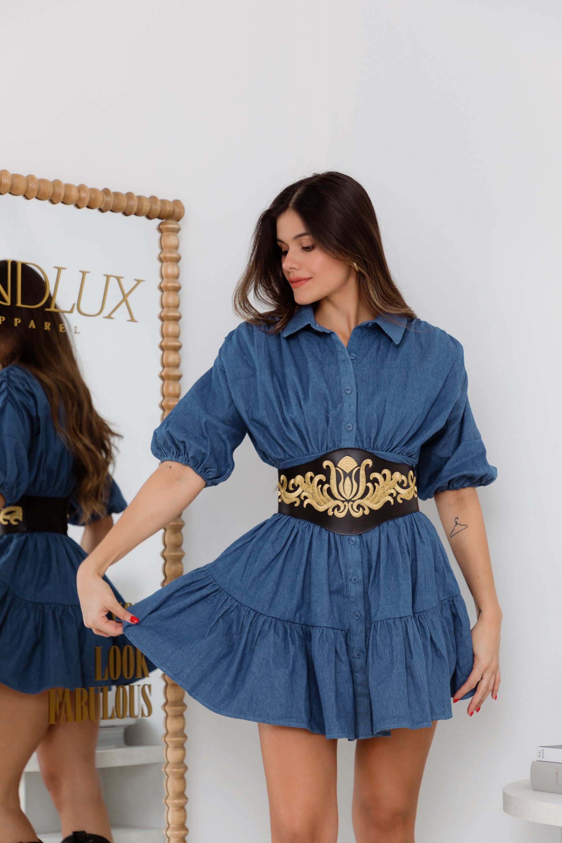 The lightweight, tiered denim skirt creates a playful silhouette, while the puffed sleeves add a touch of vintage-inspired elegance. Accentuated by a bold, embroidered statement belt, this dress brings together timeless style and modern flair.